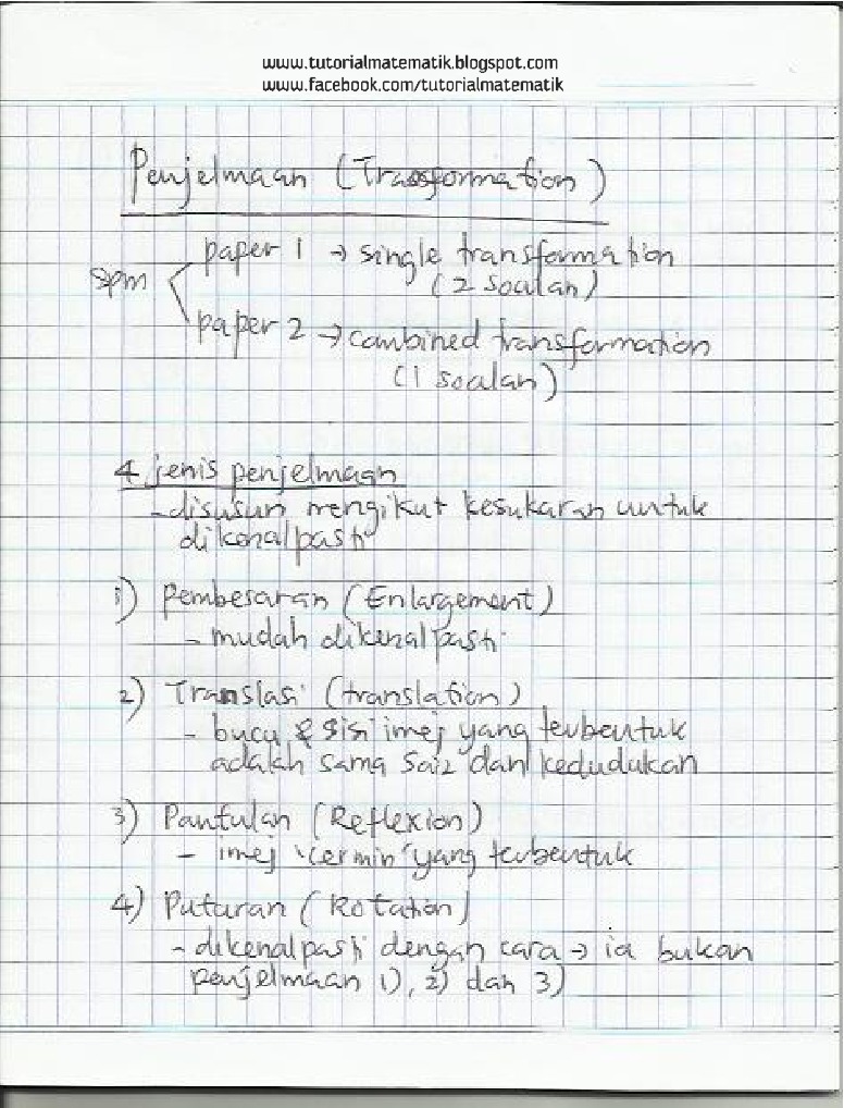 Sila Komen di ruang komen di bawah untuk sebarang pertanyaan atau cadangan soalan Nyatakan latihan mukasurat dan nombor soalan. Bab 10 penjelmaan. Matematik Tingkatan 4 Dan 5.